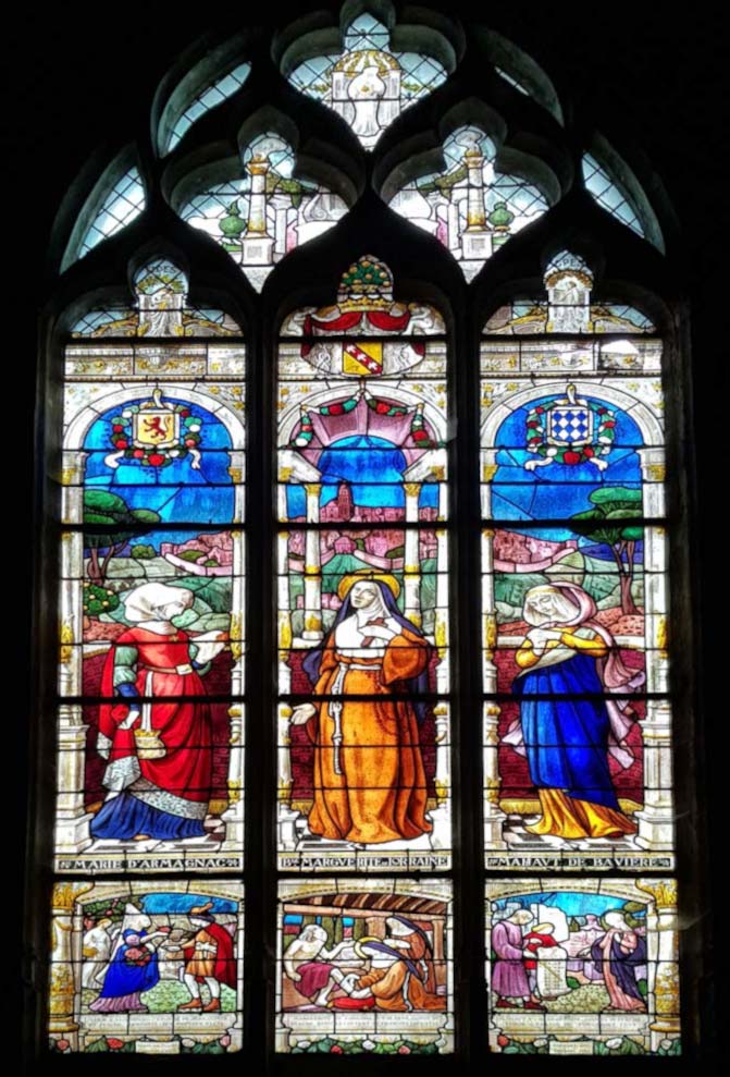 L’église Notre-Dame reconstruite et agrandie après la guerre de 100 ans à l’emplacement de la chapelle seigneuriale du fort Toussaint, possède un vitrail de ces trois femmes remarquables.