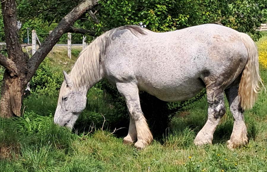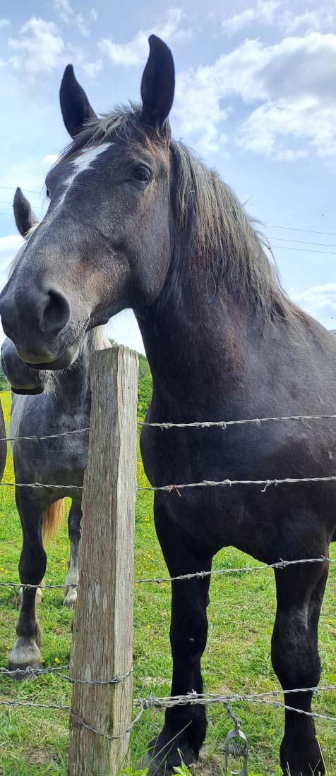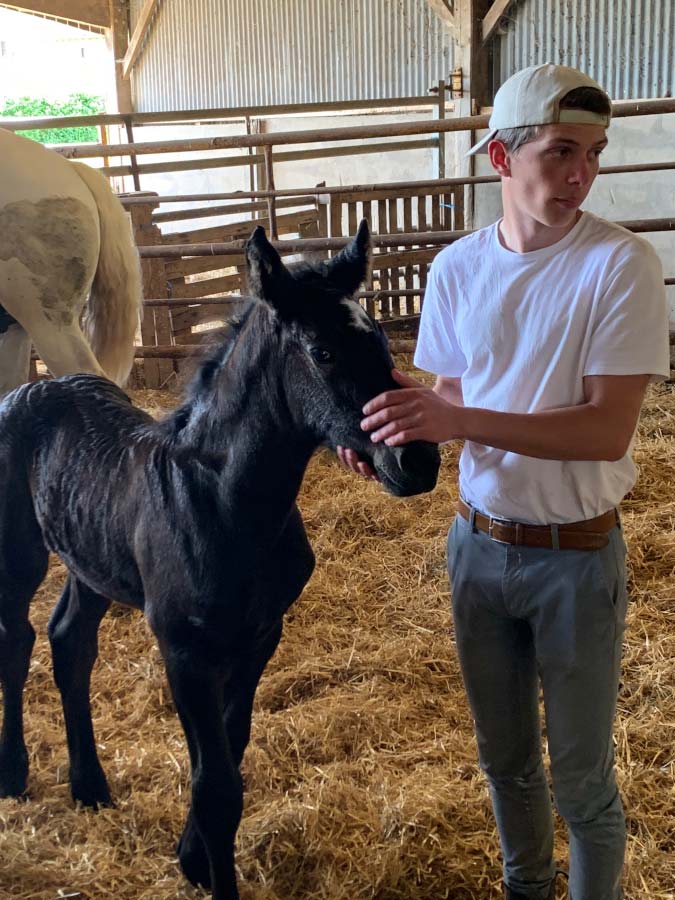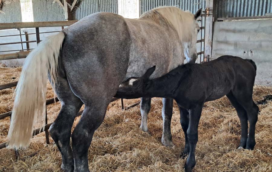 Au milieu des prés humides irrigués par la Même, couverts de renoncules boutons d’or, dans une grange remplie de fourrage, il appelle quelques pouliches percheronnes et leurs poulains vaquant dans les prés. Il nous présente ses chevaux à la robe changeante avec l’âge