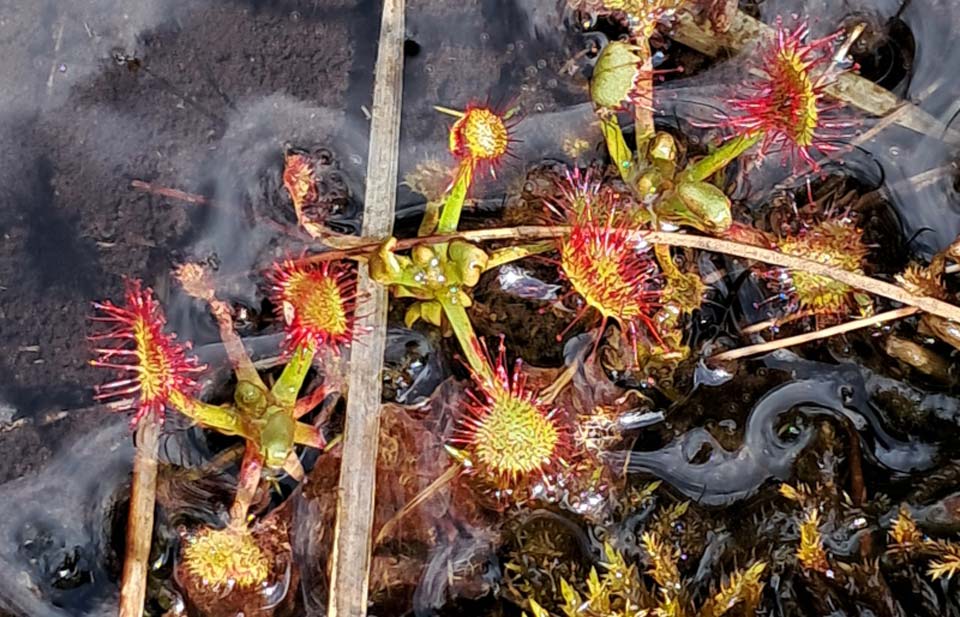 Quand les conditions d’oxygène et de qualité de l’eau ne conviennent plus, la tourbière ne fonctionne plus, les plantes s’en emparent mais la tourbe peut rester sous des roselières ou des forêts. Progressivement dégagée de sa couverture forestière, la tourbière des Froux a repris vie : elle est redevenue turbigène (productrice de tourbe) du fait de la présence d’une nappe d’eau sous-jacente permanente et de la prolifération des sphaignes (famille des Bryophytes, comme les mousses). Véritables éponges, elles croissent en retenant l’eau et leur matière organique s’accumule dans l’eau sans se décomposer. Elles sont accompagnées d’une flore caractéristique selon le gradient d’humidité : molinies, linaigrettes, grassettes du Portugal et par endroits, des merveilleuses petites droseras. Ces plantes carnivores capturent les petits insectes grâce à leurs feuilles en raquettes, surmontées de perles gluantes.