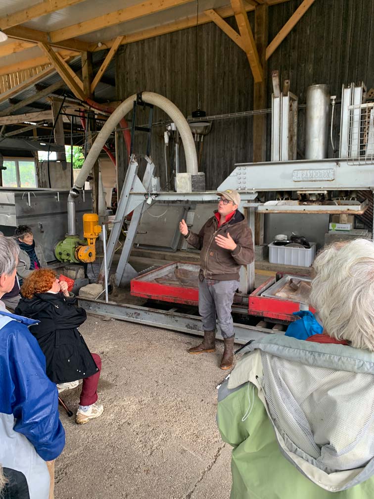 Visite guidée par Grégoire Ferré , propriétaire exploitant de la « Maison Ferré » à Comblot. Traditionnellement les fermes entretenaient des vergers pâturés pour l’autoconsommation des fruits et la fabrication du cidre. Il y avait des pommiers dans les champs cultivés, différentes variétés suivant les cantons, des milliers d’espèces de pommes.